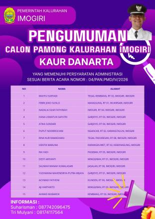 Warta Krajan, Senin (13/04) Panitia Pengisian Lowongan Pamong Kalurahan Imogiri untuk jabatan Kaur Danarta menyampaikan pengumuman daftar Calon Pamong Kalurahan yang lolos seleksi administrasi.