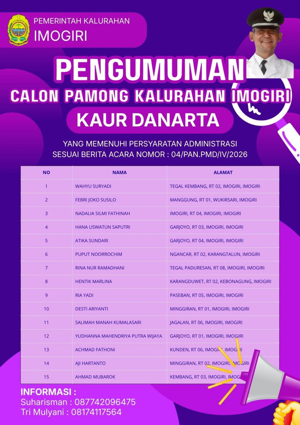 HASIL PENYARINGAN ADMINISTRASI CALON PAMONG KAUR DANARTA KALURAHAN IMOGIRI